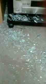 ガシャーン パリーン パチ パチパチと・・・テレビ台のガラス扉がはずれてコナゴナ。。。